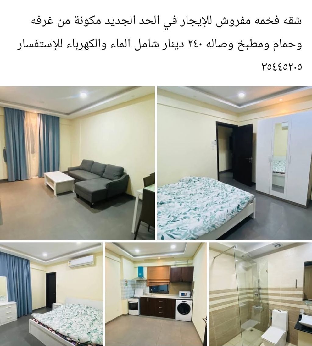 شقة فاخرة مفروشة للإيجار في الحد، تتكون من غرفة نوم واحدة ومطبخ وحمام وصالة، بسعر 240 دينار شامل الماء والكهرباء