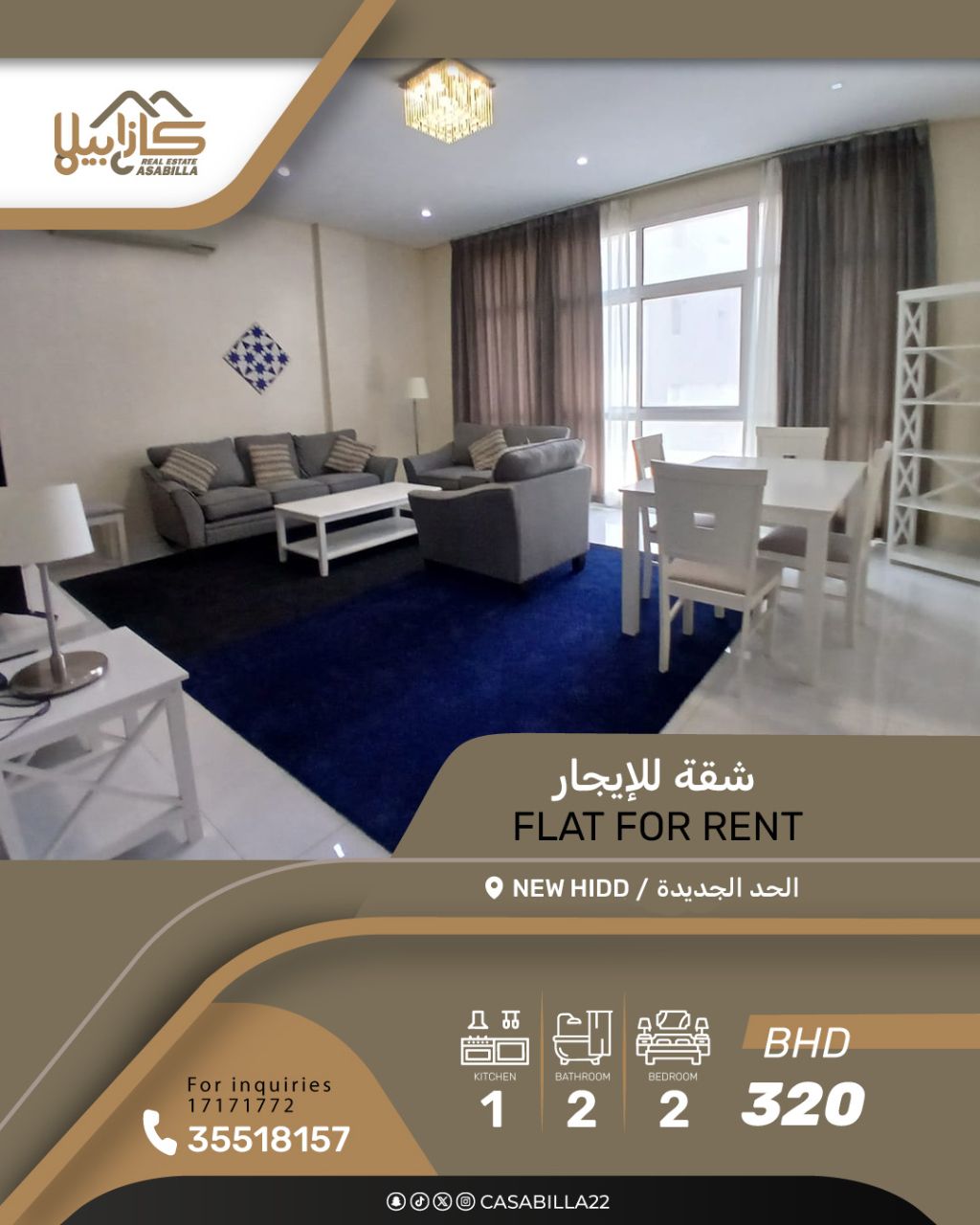 للإيجار: شقة فاخرة ومفروشة بالكامل في منطقة الحد الجديدة. تتكون من غرفتي نوم، وصالة عائلية واسعة، ومطبخ مغلق، وحمامين. وهي مفروشة بالكامل وتحتوي على مصعد، ومواقف سيارات، وحارس أمن. السعر 320 ديناراً، يشمل الكهرباء مع حد استهلاك 30 ديناراً. للاستفسار.