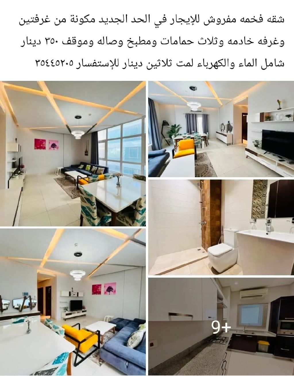 شقة فخمة مفروشة للإيجار في الحد الجديد، تتكون من غرفتين وغرفة خادمة وثلاث حمامات ومطبخ وصالة وموقف. الإيجار 350 دينار شامل الماء والكهرباء، مع وديعة 30 دينار.