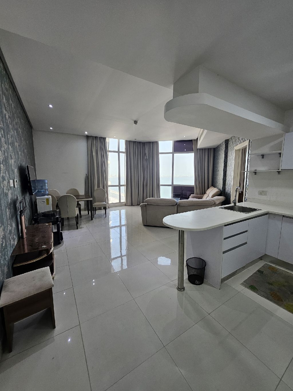 شقة سكنية مفروشة بإطلالة بحرية بسعر 300 دينار مع الإنترنت لمدة 20 دينار، مكونة من غرفة وصالة ومطبخ وحمامين وبلكونة. الخدمات تشمل جيم ومسبح وريسبشن.