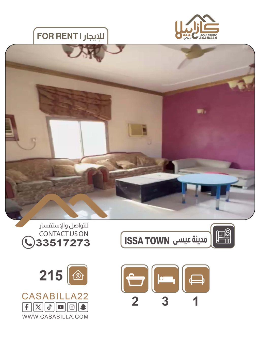 فرصة مميزة للإيجار: شقة مفروشة بالكامل مكونة من 3 غرف نوم في منطقة هادئة جداً وراقية في مدينة عيسى. أولاً، تفاصيل الشقة: 3 غرف نوم، إحداها غرفة نوم رئيسية، حمامان، صالة واسعة، مطبخ مع فرن، مكيفات هواء، وبلكونة. الخدمات والمرافق: موقف سيارات مظلل، قريبة من المركز الصحي والمدارس، سطح خاص صغير. سعر الإيجار 215 دينار، باستثناء الكهرباء والماء. للتواصل.