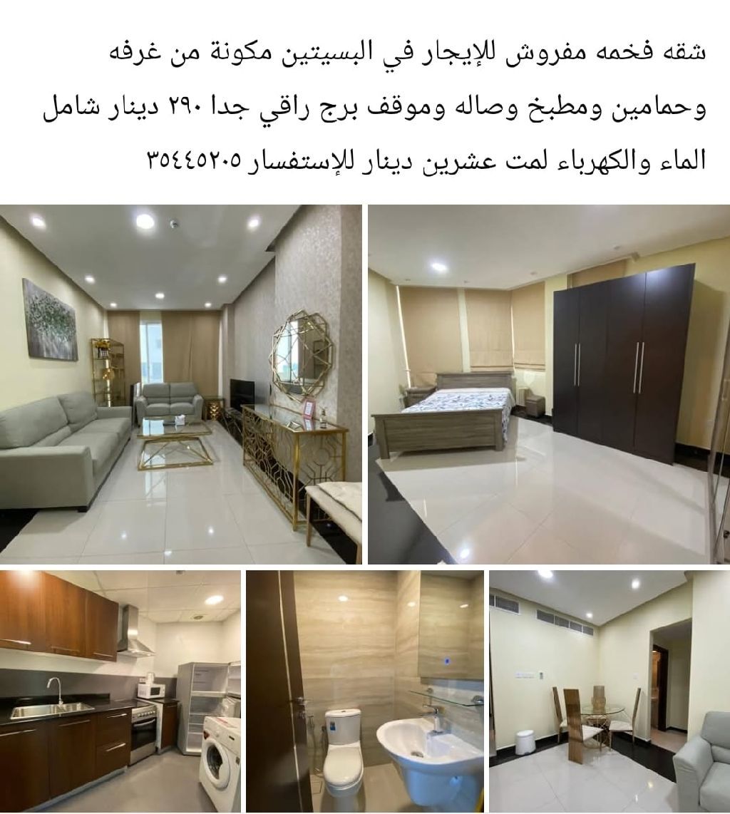 شقة فخمة مفروشة للإيجار في البسيتين، مكونة من غرفة نوم واحدة ومطبخ وحمام وصالة وموقف سيارات. مبنى راق جدا. 290 دينارا تشمل الماء والكهرباء. فرصة لا تعوض