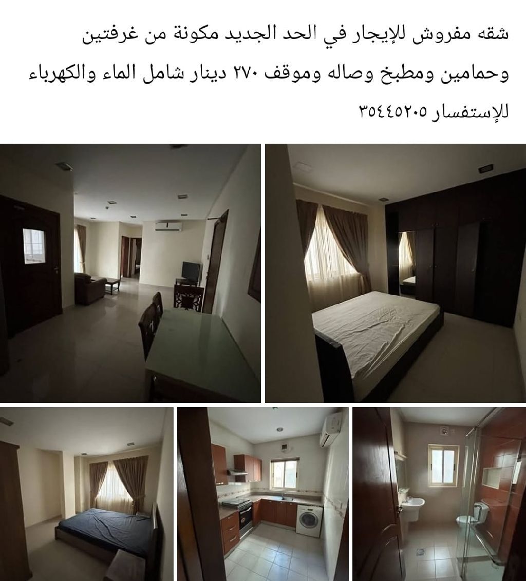 شقة مفروشة للإيجار في الحد الجديد، مكونة من غرفتين وحمامين ومطبخ وصالة وموقف، بسعر 270 دينار شامل الماء والكهرباء