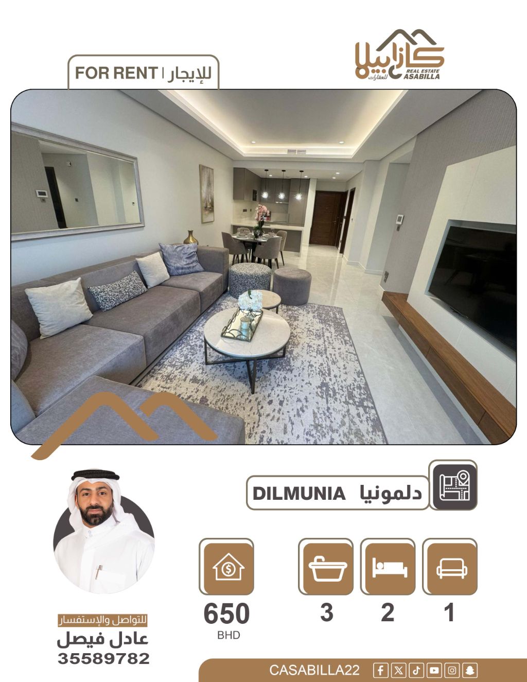 للإيجار: شقة في دلمونيا تتكون من غرفتي نوم، صالة، مطبخ، ثلاثة حمامات، وبلكونة. جميع الخدمات متوفرة: جيم، بركة سباحة، ومرافق متكاملة. الإيجار الشهري 650 دينار، يشمل الكهرباء (حد 30 دينار). للتواصل والاستفسار.