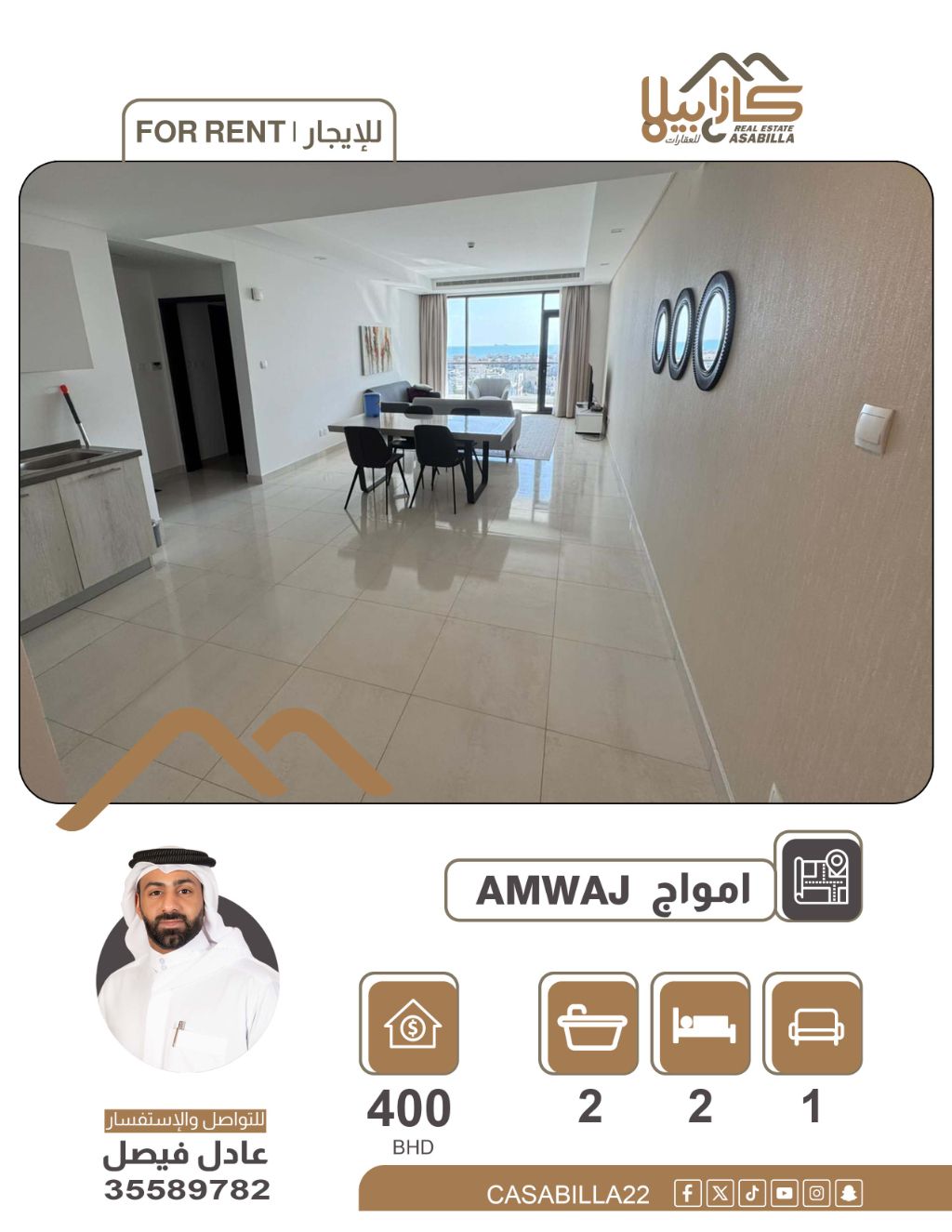 شقة غرفتين نوم في جزر أمواج، تشمل الكهرباء مقابل 400 دينار بحريني. فرصة للسكن في مبنى حديث وموقع مميز في قلب جزر أمواج. شقة متكاملة الخدمات توفر لك ولعائلتك أسلوب حياة عصري ومريح. المواصفات: غرفتين نوم - صالة واسعة - حمامين - مطبخ مجهز - بلكونة. الخدمات والمرافق: بركة سباحة - جيم (نادي رياضي) - موقف سيارة خاص - مصعد. السعر: 400 دينار بحريني شهرياً (يشمل الكهرباء بحد أقصى 30 دينار). للحجز والاستفسار.