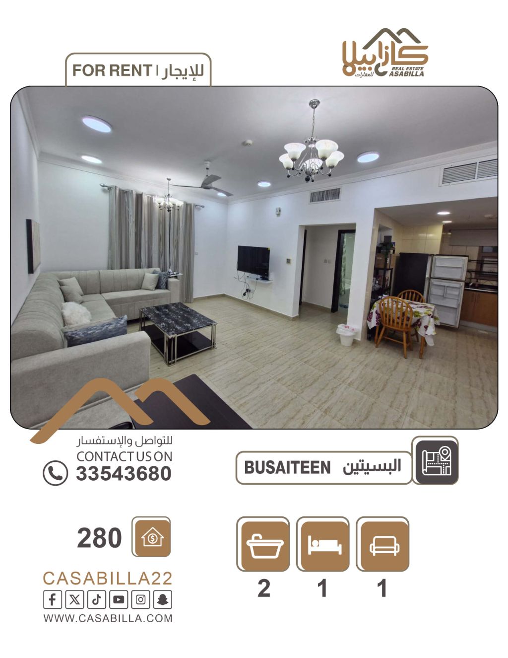 للإيجار: شقة مفروشة بالكامل في البسيتين. تفاصيل الشقة: غرفة ماستر، صالة، حمامين، مطبخ، بلكونة. المرافق والخدمات: مفروشة بالكامل، مصعد، موقف سيارة، بالقرب من جميع الخدمات الرئيسية، حارس 24 ساعة، جيم، مسبح. سعر الإيجار: 280 دينار شامل، مع 20 دينار للمرافق. للتواصل.