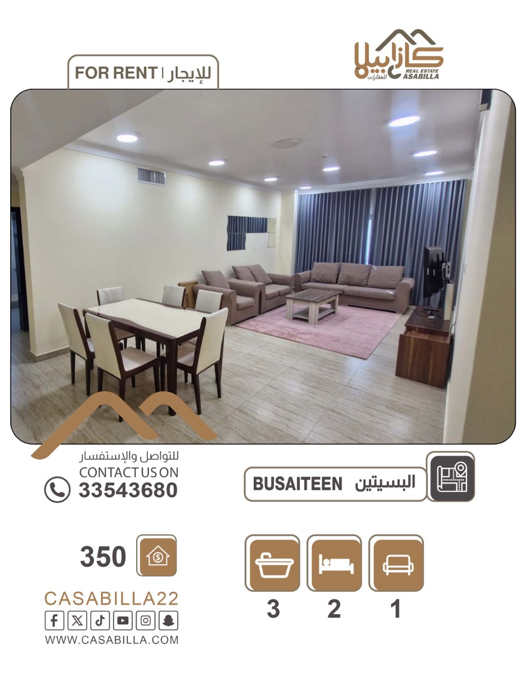 للإيجار: شقة في البسيتين مفروشة بالكامل. تفاصيل الشقة: غرفتين نوم (بما في ذلك غرفة ماستر)، غرفة خادمة، 3 حمامات، مطبخ مغلق. المرافق والخدمات: مفروشة بالكامل، مصعد، موقف سيارة، بالقرب من جميع الخدمات الرئيسية، حارس 24 ساعة، جيم، مسبح. سعر الإيجار: 350 دينار شامل، مع 40 دينار رسوم صيانة. للتواصل.