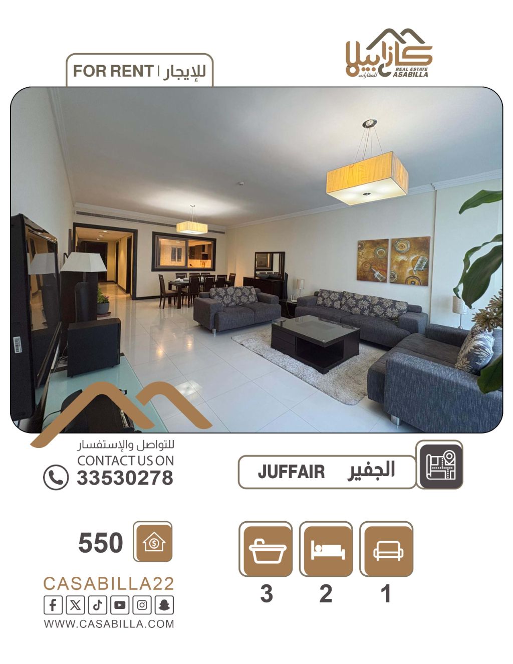 شقة للإيجار في منطقة الجفير، بإطلالة مرتفعة ورفاهية متكاملة في قلب الجفير. استمتع بتجربة سكنية راقية في الطابق الثالث عشر، حيث تلتقي الرحابة بالتصميم العصري. شقة مثالية للعائلات الصغيرة أو الباحثين عن الهدوء والخصوصية، مع إطلالات مميزة على معالم الجفير. شقة 142: غرفتين، صالة، 3 حمامات. السعر: 550 دينار. حد الكهرباء: 40 دينار. للتواصل.