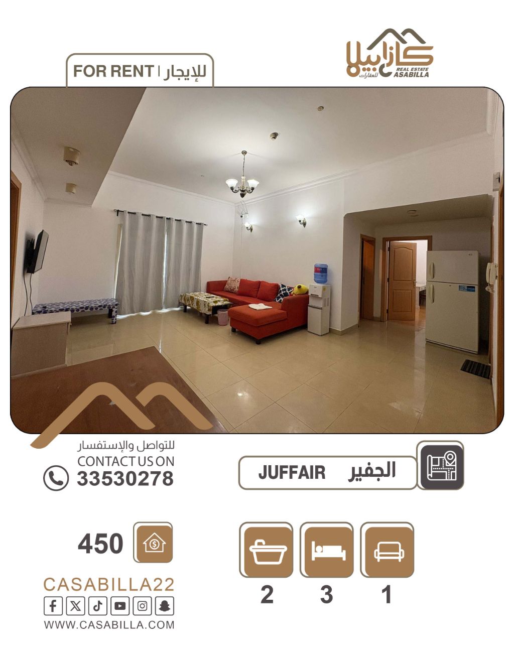شقة للإيجار في منطقة الجفير، سعة عائلية وقيمة استثنائية في قلب الجفير. اغتنم فرصة السكن في شقة واسعة مكونة من 3 غرف نوم، مصممة لتلبي احتياجات العائلات التي تبحث عن الرحابة والراحة. تتميز بموقع استراتيجي وسعر منافس جداً، مع بلكونه خاصة تضفي لمسة من التجدد على يومك. 3 غرف، صالة، حمامين، بلكونه. السعر: 450 دينار. الكهرباء ليمت 30 دينار. للتواصل.