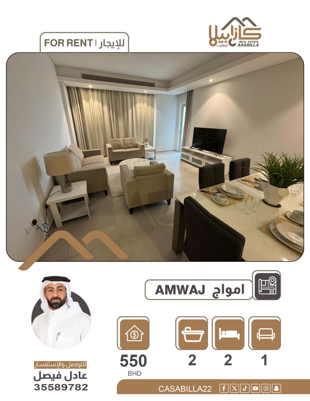 للإيجار: شقة في جزر أمواج، تقدم رفاهية السكن البحري. استمتع بتجربة سكنية استثنائية في واحدة من أرقى الوجهات الساحلية في البحرين. هذه الشقة الأنيقة تتميز بتصميم عصري ومساحات مريحة، تمنحك الهدوء والخصوصية التي تبحث عنها، مع سهولة الوصول إلى أرقى المطاعم والخدمات والمرافق الترفيهية في جزر أمواج. تتكون من غرفتي نوم، صالة، حمامين، ومطبخ. الإيجار الشهري 550 دينار، مع تضمين الكهرباء حتى 50 دينار. للتواصل والاستفسار.