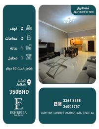 يوجد لدينا شقة للإيجار مفروشة بالكامل شامل الكهرباء لمت (60) دينار نظيفة جدا في منطقة مميزة قريب من الخدمات في الجفير. تتكون من 2 غرفتين نوم واسعة، 2 حمامين، 1 مطبخ، 1 صالة واسعة وكبيرة. يوجد في البرج مصعد وحارس أمن ومواقف. السعر المطلوب (350) دينار للتواصل مكتب إشبيلية بوعبدالله B201804 / 0125 رقم الرخصة. اعلان رقم (131).