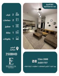 يوجد لدينا شقة للإيجار مفروشة بالكامل شامل الكهرباء بدون لمت نظيفة جدا في منطقة مميزة قريب من الخدمات في الجفير. تتكون من 2 غرفتين نوم واسعة، 2 حمامين، 1 مطبخ، 1 صالة واسعة وكبيرة، و1 بلكونه. يوجد بركة سباحة في البرج، مصعد، حارس أمن، ومواقف. السعر المطلوب 350 دينار. للتواصل مكتب إشبيلية، رقم الرخصة B201804 / 0125. اعلان رقم 111.