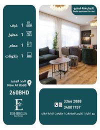 يوجد لدينا شقة استوديو مفروشة بالكامل للإيجار، تشمل الكهرباء والماء بمبلغ 20 دينار. تتمتع بإطلالة بحرية، نظيفة جداً، وتقع في منطقة راقية في الحد الجديد، قريبة من الخدمات. تقع في الطابق السابع من برج يحتوي على جميع الخدمات الترفيهية. تتكون الشقة من: غرفة نوم واسعة واحدة، حمام واحد، صالة واحدة، مطبخ بنظام أمريكي، وبلكونة واحدة. السعر المطلوب هو 260 دينار. للتواصل: مكتب إشبيلية، B201804 / 0125، رقم الرخصة. رقم الإعلان (110).