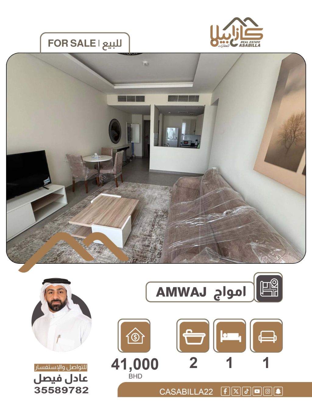 للإيجار أو للبيع - شقة في أمواج. شقة متميزة للإيجار أو البيع في جزر أمواج، فرصة مرنة للسكن أو الاستثمار في واحدة من أرقى المناطق البحرية في البحرين. الشقة مفروشة بالكامل، تتميز بتصميم عصري واستغلال ذكي للمساحات، مما يجعلها خياراً مثالياً للأفراد أو كاستثمار عقاري بعائد مجزٍ. تفاصيل الشقة: غرفة نوم واحدة - صالة - مطبخ - حمامان. الكهرباء مشمولة (حد 20 ديناراً). الإيجار الشهري: 320 ديناراً. سعر البيع: 41,000 دينار (قابل للتفاوض).