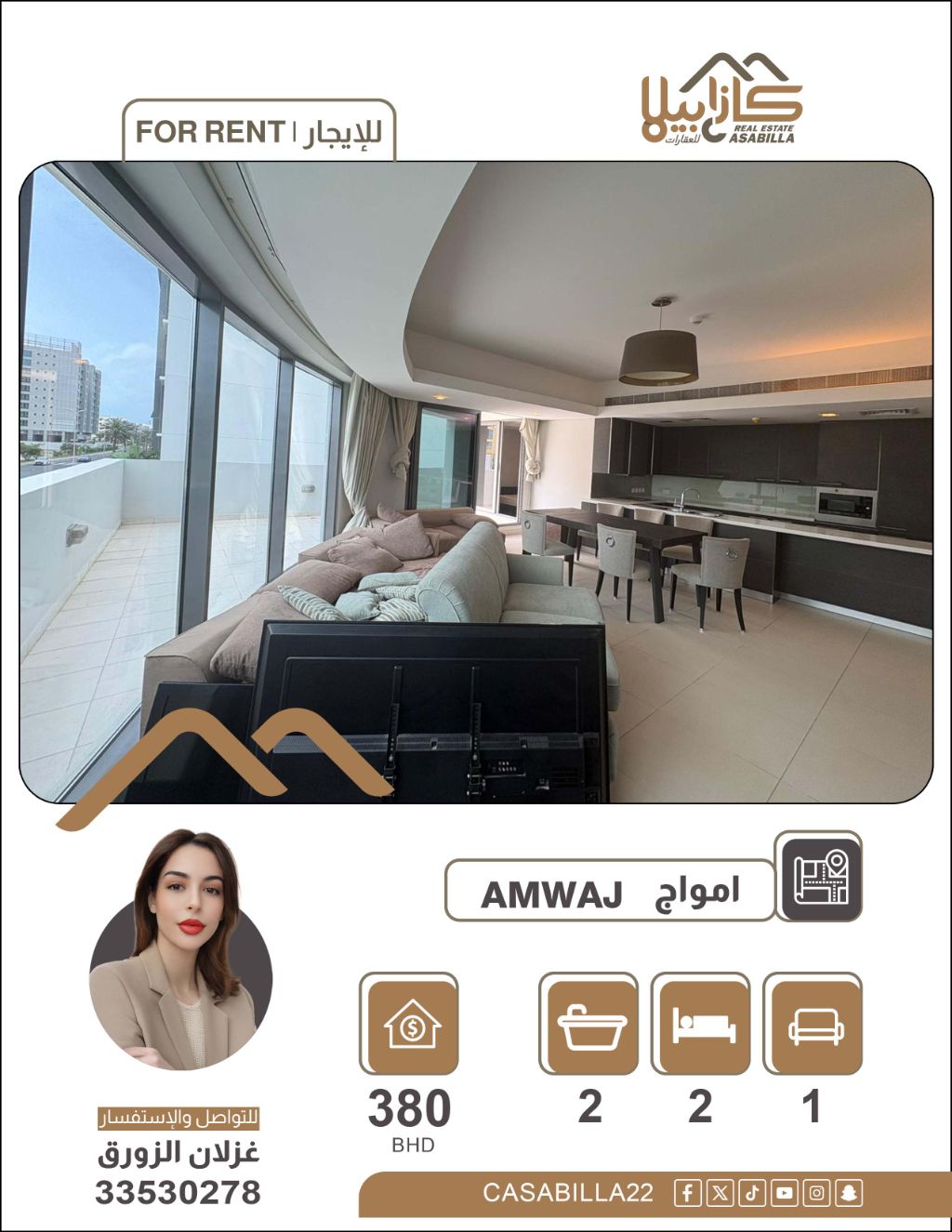 شقة للإيجار في منطقة أمواج. شقة متميزة للإيجار في جزر أمواج. استمتع بالعيش في واحدة من أرقى الوجهات البحرية في البحرين. تتميز هذه الشقة بتصميم ذكي يوفر مساحات إضافية للراحة والعملية، مع ميزة الشرفات المزدوجة وغرفة الغسيل المستقلة في موقع هادئ وراق. غرفتين + غرفة غسيل، مطبخ، صالة، حمامين، بلكونتين. السعر: 380 دينار. الكهرباء: 30 دينار. للتواصل.