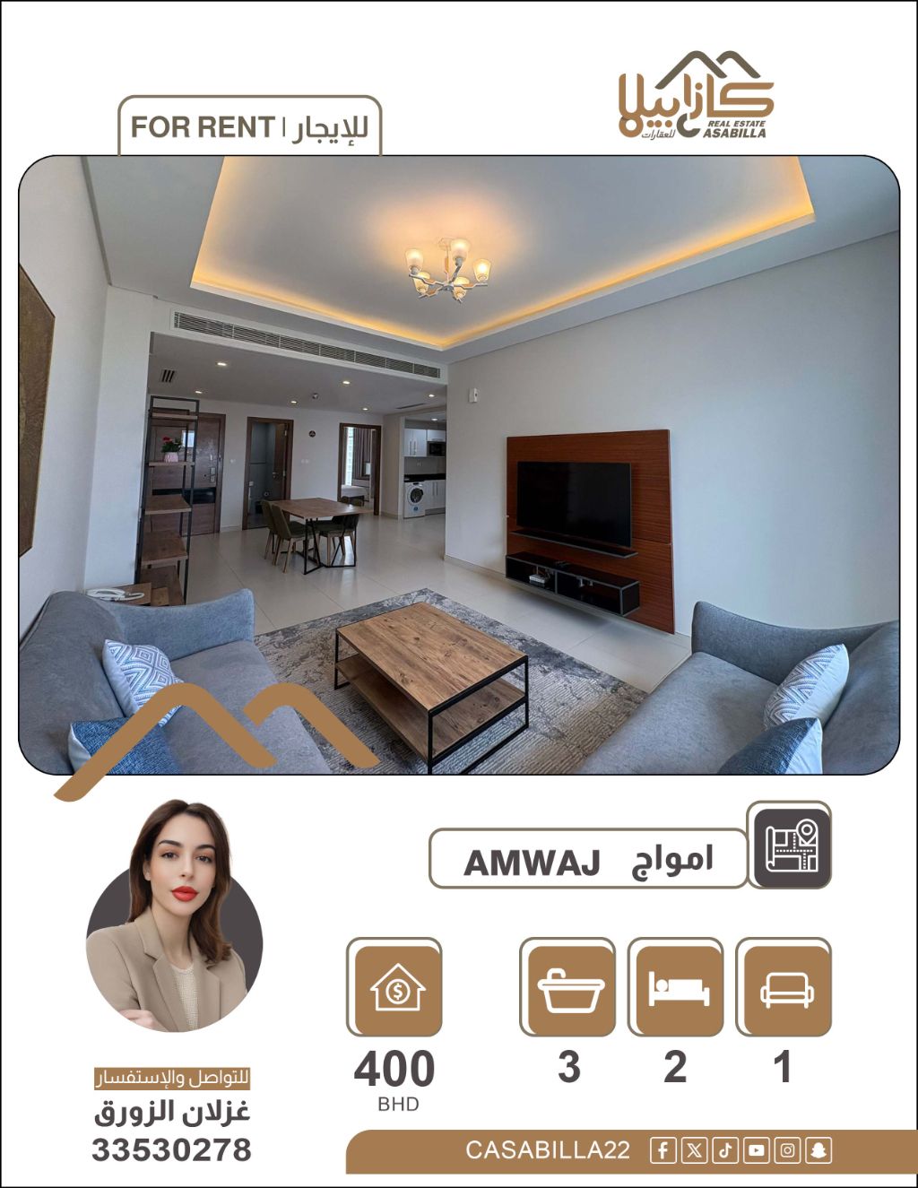 شقة للإيجار في منطقة أمواج. شقة متميزة للإيجار في جزر أمواج. استمتع بتجربة سكنية راقية في قلب جزر أمواج. توفر هذه الشقة توازنا مثاليا بين المساحة والخصوصية، مع تصميم عصري يضم غرفتي نوم وثلاثة حمامات لضمان راحة تامة لجميع أفراد العائلة في موقع هادئ ومتميز. غرفتين، مطبخ، صالة، 3 حمامات، بلكونه. السعر: 400 دينار. الكهرباء: 25 دينار. للتواصل.