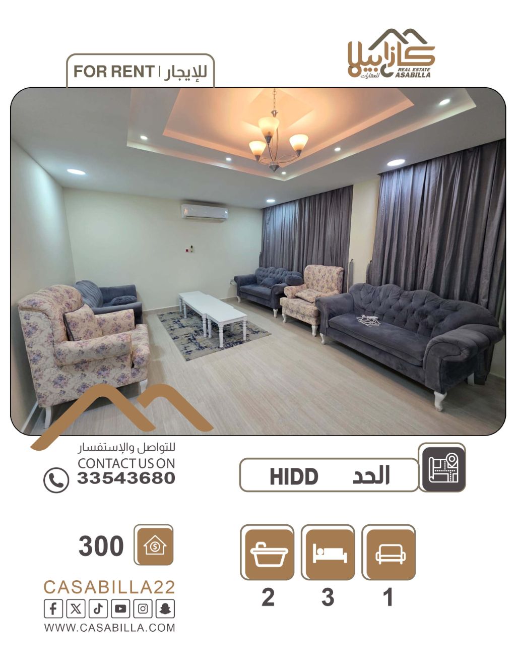 للإيجار شقة مفروشة شامل الكهرباء في الحد. تفاصيل الشقة: 3 غرف (غرفة ماستر)، 2 حمام، صالة، مطبخ. المرافق والخدمات: موقف سيارة بالقرب من الشارع الرئيسي، مع مكيفات وستائر، حارس للبناية. سعر الإيجار: 300 دينار شامل 40 دينار للمرافق. للتواصل.