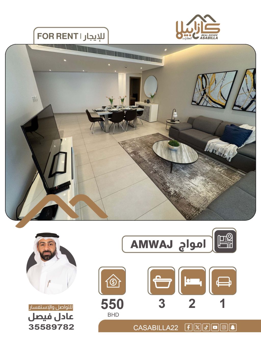 للإيجار - شقة في أمواج. شقة مميزة بموقع جميل وراقي في أمواج، مناسبة للسكن المريح وقريبة من جميع الخدمات. تفاصيل الشقة: غرفتين نوم - صالة - 3 حمامات - مطبخ - بلكونة. المميزات: انترنت - صالة رياضية (جيم) - بركة سباحة. الإيجار الشهري: 550 دينار. للتواصل والاستفسار.