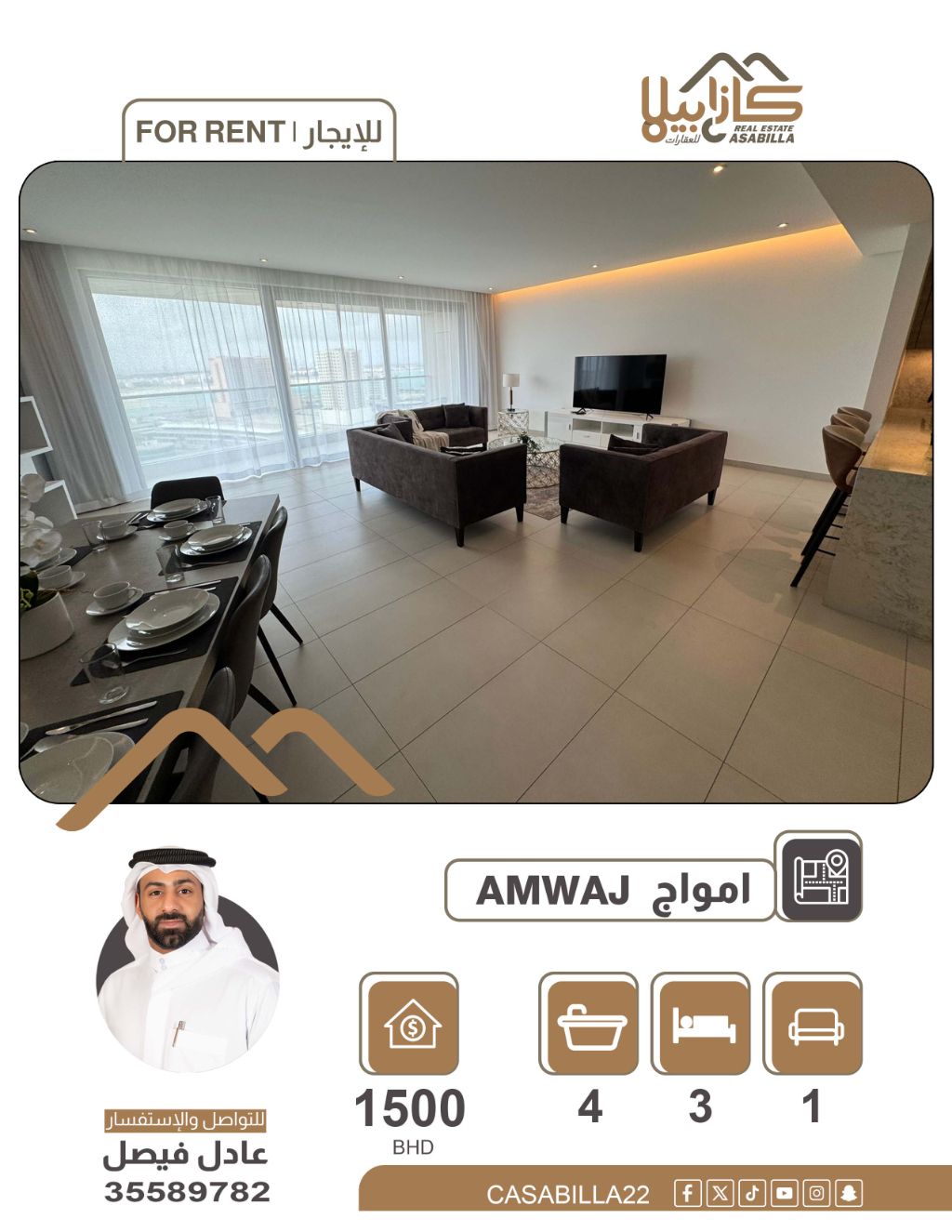 للإيجار - شقة فاخرة في أمواج باطلالة على اللاجون. فرصة مميزة للسكن في موقع راقي وجميل في أمواج، مع اطلالة مباشرة على اللاجون. تفاصيل الشقة: 3 غرف نوم - مكتب - صالة كبيرة وواسعة - مطبخ - بلكونه باطلالة على اللاجون المميز. المميزات: موقع مميز وهادئ - اطلالة رائعة - قريبة من جميع الخدمات. الإيجار الشهري: 1500 دينار. للتواصل والاستفسار.