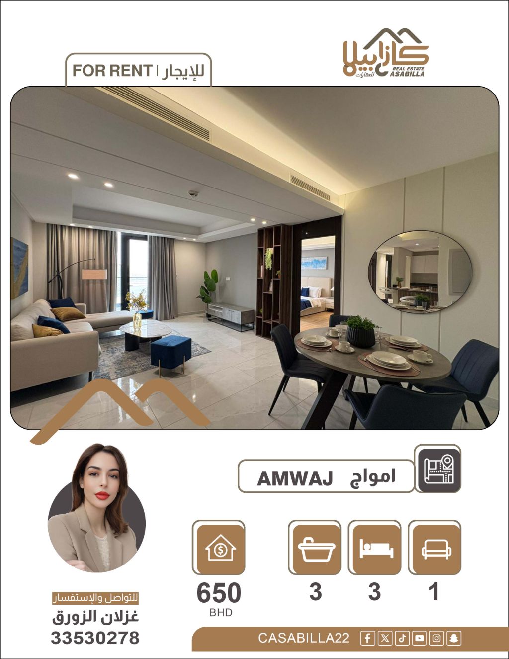 شقة للإيجار في منطقة أمواج. شقة مفروشة بالكامل للإيجار في جزر أمواج - 3 غرف نوم. استمتع بتجربة سكنية فاخرة ومريحة في قلب جزر أمواج. شقة واسعة ومفروشة بالكامل بأثاث أنيق، تتميز بتصميم عائلي متكامل يوفر الخصوصية والراحة مع شرفات مزدوجة واطلالات جميلة، جاهزة للسكن الفوري. 3 غرف، مطبخ، صالة، 3 حمامات، 2 بلكونة. السعر 650 دينار، الكهرباء 30 دينار، مفروشة. للتواصل.