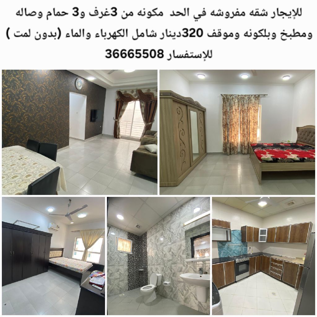 للإيجار شقة مفروشة في الحد مكونة من 3 غرف و3 حمامات وصالة ومطبخ وبلكونه وموقف سيارات بسعر 320 ديناراً، يشمل الكهرباء والماء (بدون الأثاث).