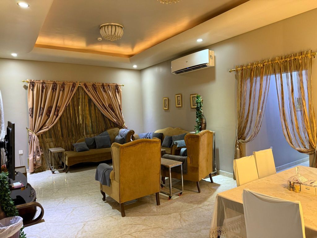 For rent, an apartment in Riffa Al Bahri, includes electricity, fully furnished, consisting of three rooms, a hall, and four bathrooms, with a parking space. Price is only 400 dinars.