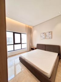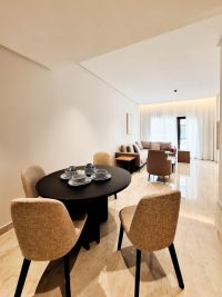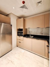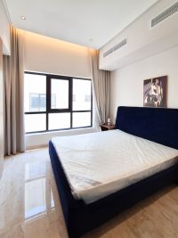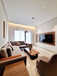 For rent: A new, fully furnished apartment in the Al Zinj area, including electricity and water. The apartment features two bedrooms, two bathrooms, a living room, a kitchen, a swimming pool, and a gym. The monthly rent is 500 Bahraini dinars, inclusive of electricity, water, and internet. For inquiries, please contact the following numbers.
