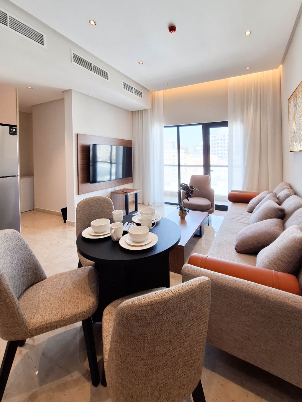 For rent: a new and fully furnished apartment in the Al-Zinj area, including electricity and water. Features of the apartment include one bedroom, one bathroom, a living room, a kitchen, a swimming pool, and a gym. The monthly rent is 320 Bahraini dinars, including electricity, water, and internet. For inquiries, please contact us at the following numbers.