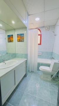 For rent A fully furnished 2 - bedroom apartment in the Diplomatic Area. The apartment consists of 2 bedrooms, 2 bathrooms, and a guest bathroom. It has a spacious living room, a closed kitchen, split air conditioning, fresh water inside the apartment, free WiFi - and TV channels. Building amenities include a swimming pool, gym, steam room, squash court, billiards table, self - service shared laundry room
