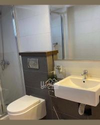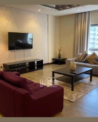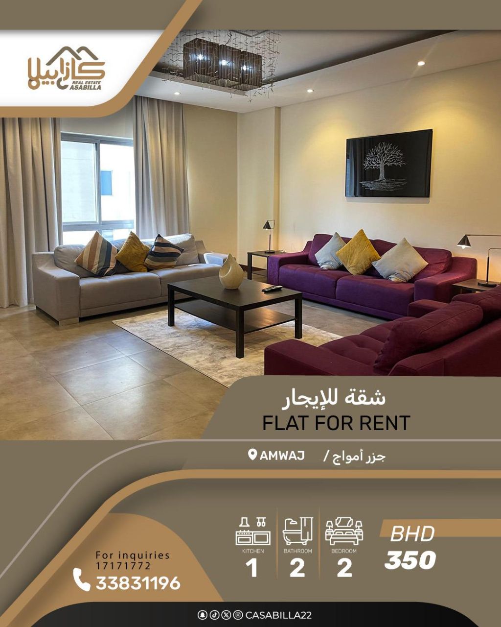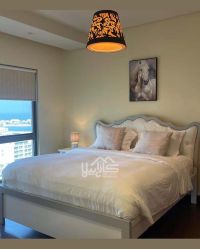 For rent: a deluxe apartment in Amwaj, close to the lake. First, apartment details: one large family living room, one kitchen, one laundry room, two bedrooms, and two bathrooms. Second, facilities and services: central air conditioning, reception, elevator, shaded parking, and close to services. Third, rent: 350 dinars including electricity and water. For contact and inquiries.