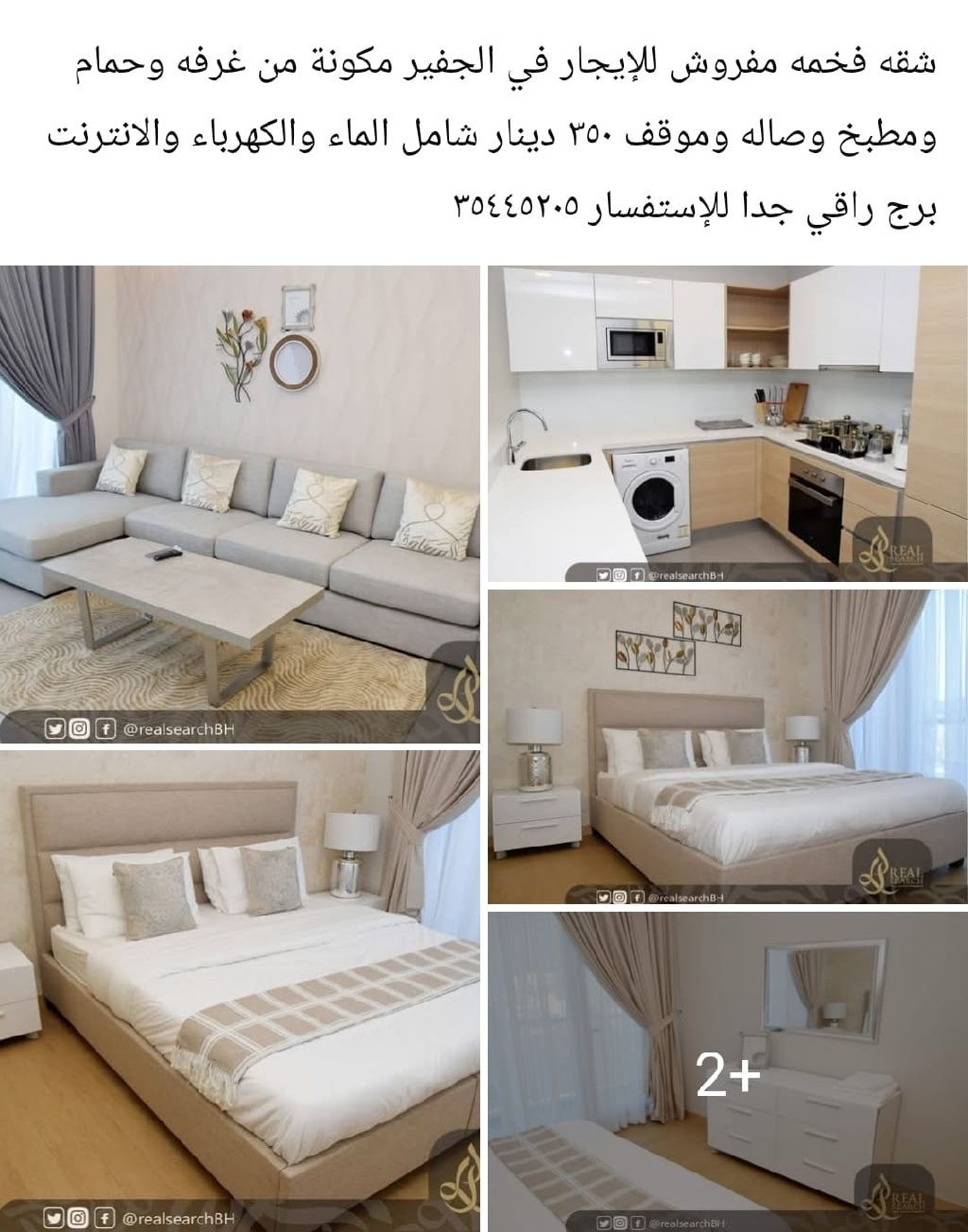 A luxurious furnished apartment for rent in Al Juffair, consisting of one bedroom, a kitchen, a bathroom, a living room, and a parking space for 350 dinars, including water, electricity, and internet, in an upscale tower.