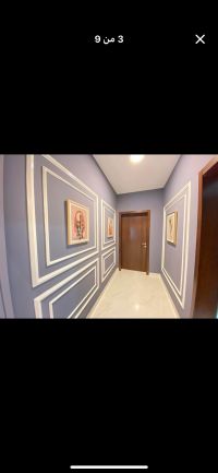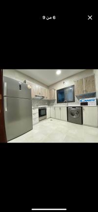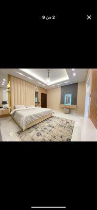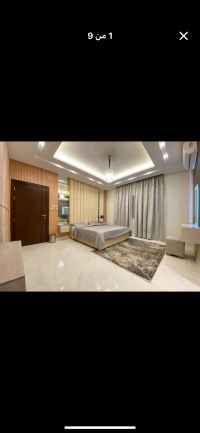 Furnished apartment for rent in Al Bussiteen. The apartment is close to the Al Arabat area. It features luxurious hotel-style furniture and consists of two bedrooms, two bathrooms, a kitchen, a living room, and parking. The rent is 420 dinars, and the electricity is 20 dinars.
