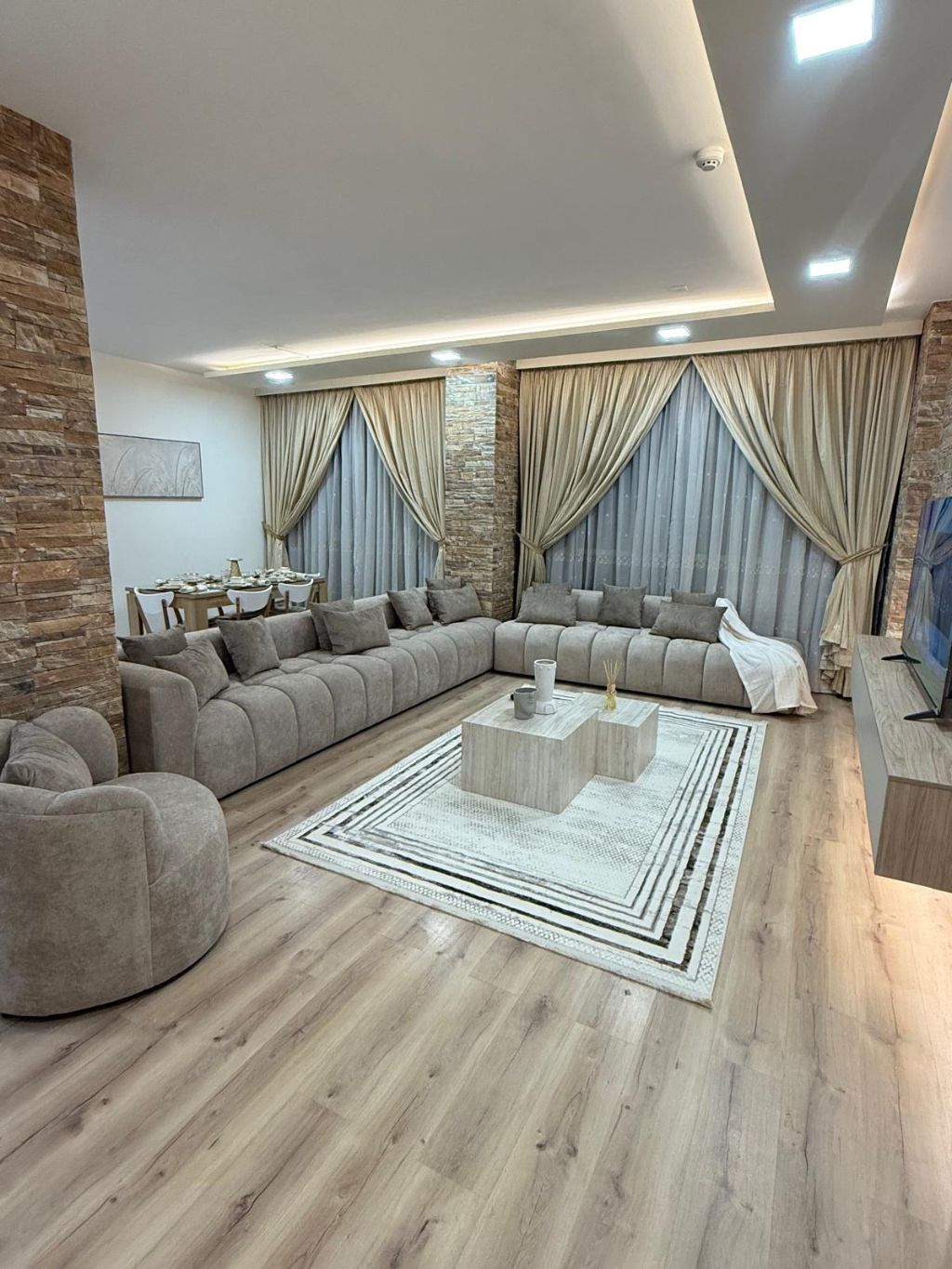 For rent: A luxurious two-bedroom apartment with a living room, two bathrooms, a separate kitchen, and new, unused furniture in Al Juffair. A very prime location for 350 dinars or 380 dinars including electricity and water at 30 dinars.