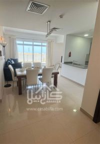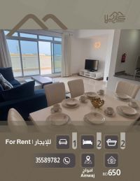 For rent: A luxurious apartment in Amwaj Islands - prime location and quiet area. A distinctive apartment in a modern building consisting of two bedrooms, a spacious living room, two bathrooms, a fully equipped kitchen, and a balcony with a beautiful view. Building amenities include an elevator, reception desk, parking spaces, 24-hour security, swimming pool, and includes electricity and water. Monthly rent: 650 dinars.