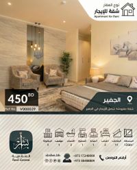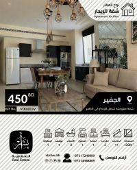 For rent: A fully furnished apartment in the Al Juffair area, consisting of two bedrooms, a living room, two bathrooms, a kitchen, a parking space, and a balcony. The asking price is 450 dinars (negotiable). For inquiries and communication, contact Abashar Real Estate Services. Call us - and Abashar simplifies distances - for inquiries and communication.