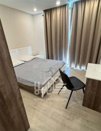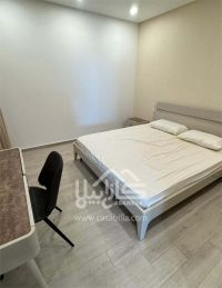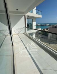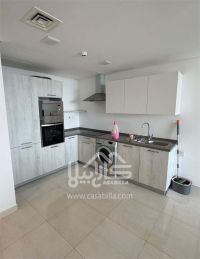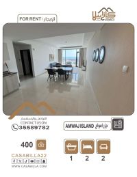 For rent: An apartment in Amwaj Islands. It consists of two bedrooms, a living room, two bathrooms, a kitchen, and a balcony. Building features include an elevator, parking, a gym, and a swimming pool. The monthly rent is 400 dinars, including electricity and water up to a maximum of 30 dinars.