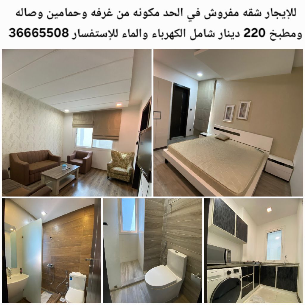 For rent, a furnished apartment in Al-Hidd consisting of one room, two bathrooms, a hall, and a kitchen for 220 dinars including electricity and water.