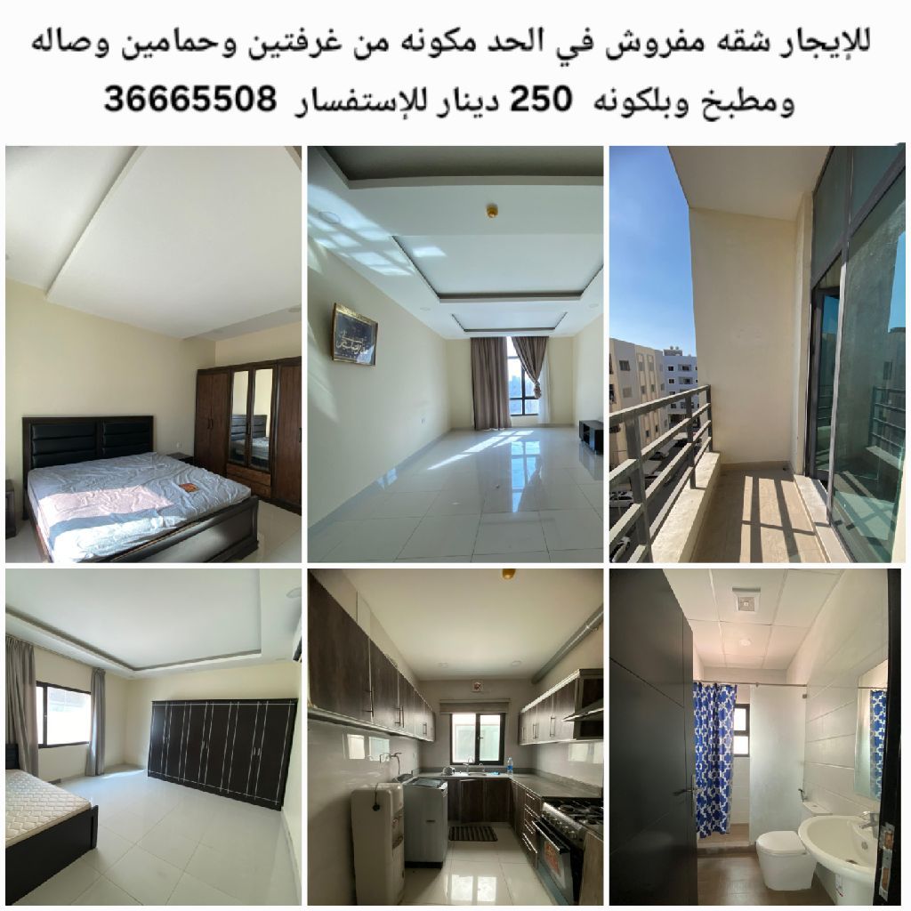 For rent, a furnished apartment in Al-Hadd consisting of two bedrooms, two bathrooms, a living room, a kitchen, and a balcony for 250 dinars.