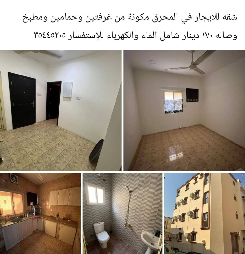 An apartment for rent in Muharraq consisting of two rooms, two bathrooms, a kitchen, and a hall for 170 dinars, including water and electricity. An opportunity not to be missed.