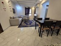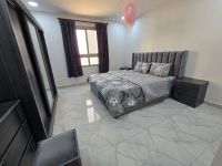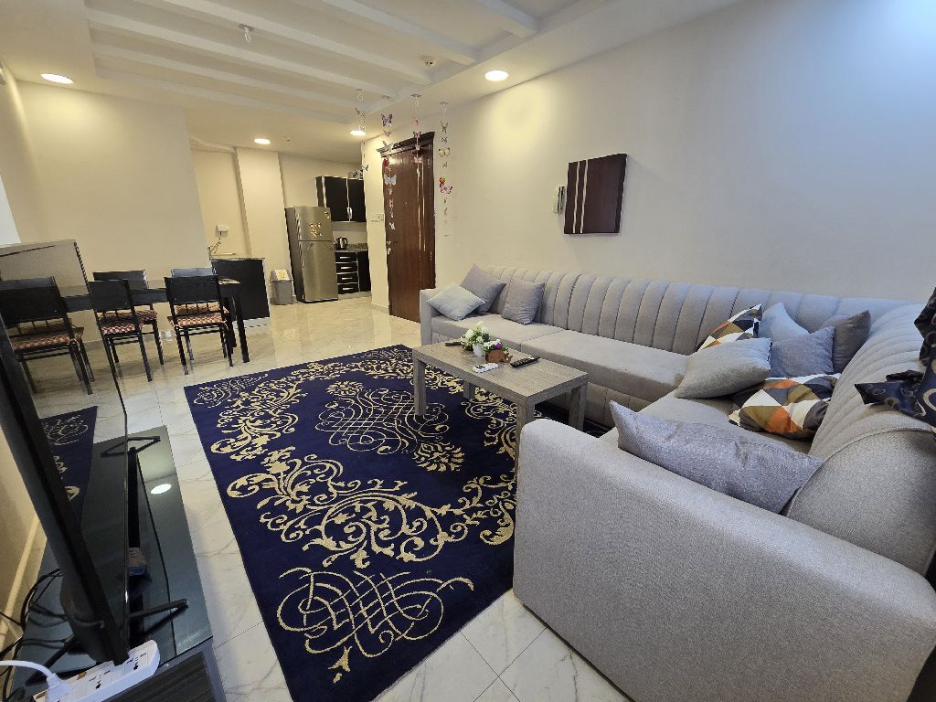 Furnished apartment for rent in Janabiyah, including electricity. The apartment consists of 2 bedrooms, 2 bathrooms, a living room, a kitchen, an elevator, a parking space, and a security guard. Rent is BD300. For inquiries, note that electricity is limited.