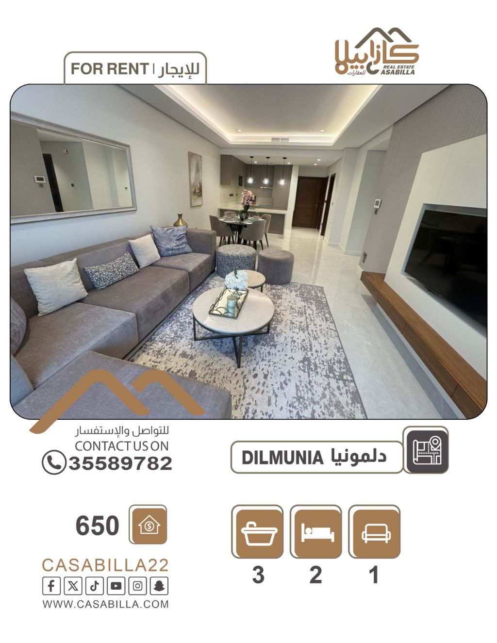 For rent: An apartment in Delmonia. A distinctive apartment in an upscale location, consisting of two bedrooms, a living room, a kitchen, three bathrooms, and a balcony. The apartment area is 129 square meters. Features include a gym, swimming pool, restaurant, and all services are available. Monthly rent is 650 dinars, including electricity. For contact and inquiries.