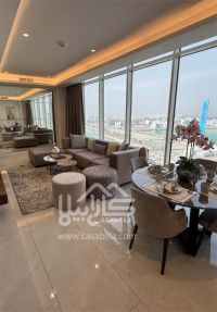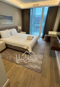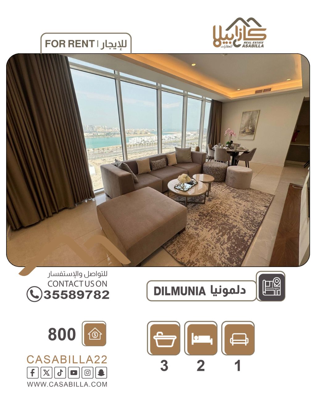 For rent: A furnished apartment in Dilmunia. A luxurious and fully furnished apartment consisting of two bedrooms, a living room, three bathrooms, a kitchen, and a balcony. The apartment area is 122 square meters. Features include an elevator, swimming pool, gym (fitness center), restaurant, and all services are available. Monthly rent is 800 dinars, including electricity for up to 60 dinars. For contact and inquiries.