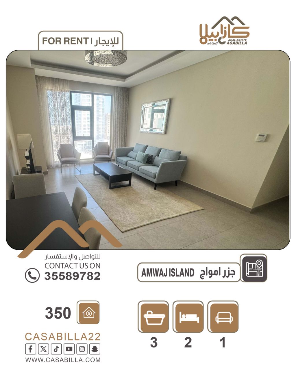 For rent: An apartment in Amwaj Islands consisting of two bedrooms, a living room, a kitchen, and three bathrooms. Fully furnished and ready for occupancy with all services available, including an elevator, car parking, a gym, and a swimming pool. Prime location close to all services. Monthly rent is 350 dinars inclusive, with a limit of 20 dinars. For contact and inquiries.