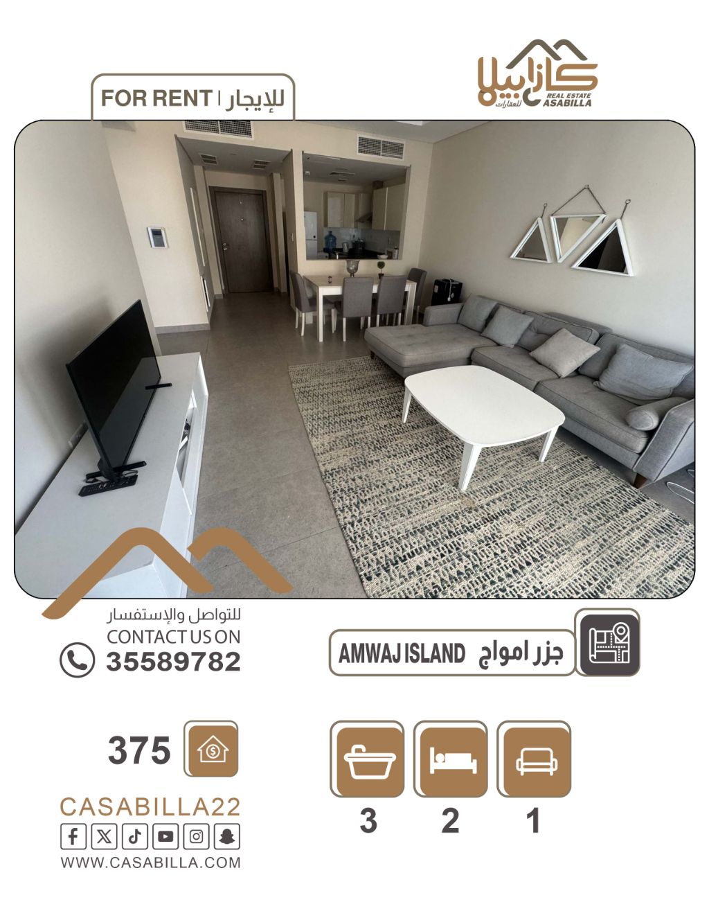 For rent: An apartment in Amwaj Islands consisting of two bedrooms, a living room, a kitchen, and three bathrooms with a balcony, fully furnished and ready for occupancy. Modern building with an elevator and all services provided. Prime location close to all amenities. Monthly rent is 375 dinars, including a limit of 20 dinars. For contact and inquiries.