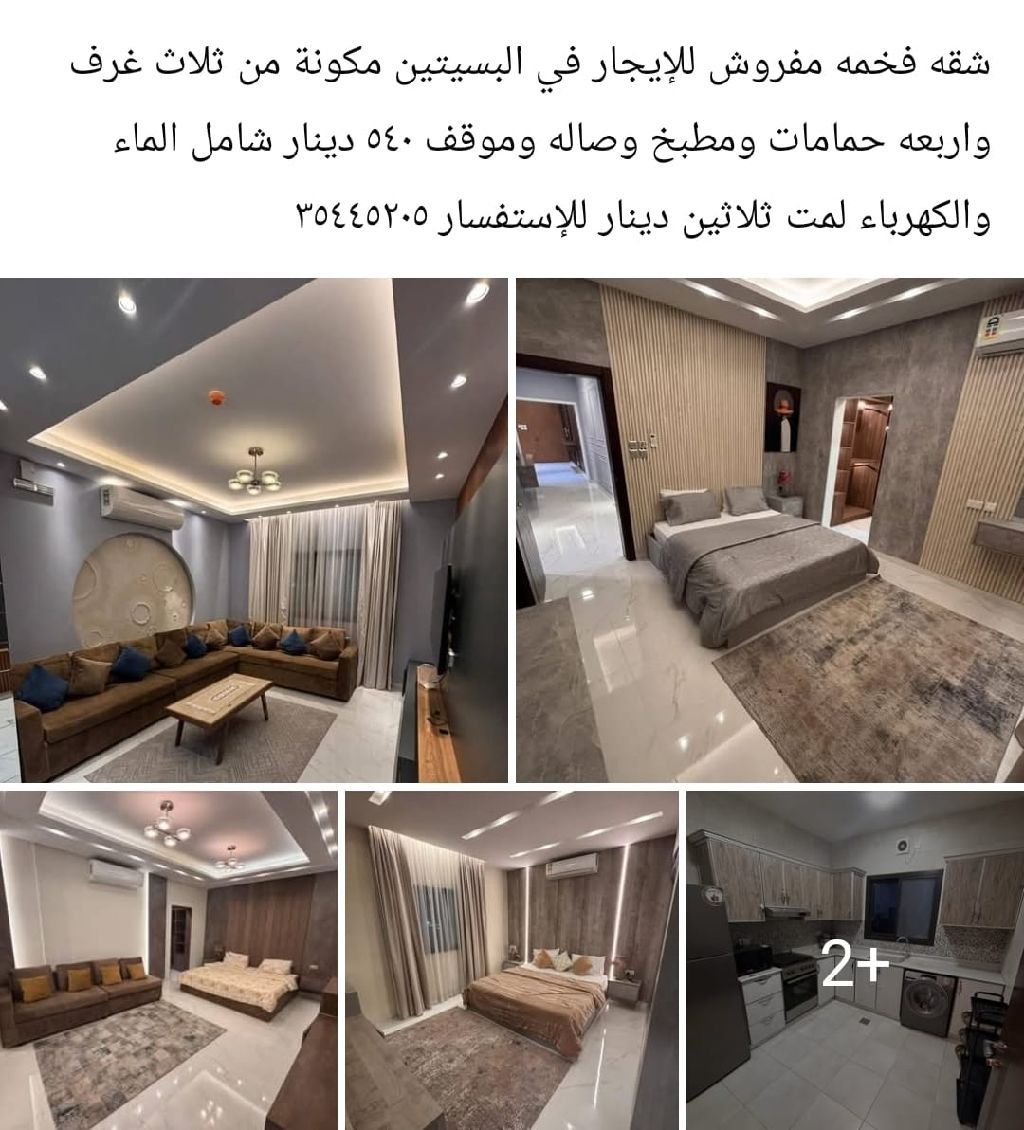 A luxurious furnished apartment for rent in Al-Busaiteen, consisting of three rooms, four bathrooms, a kitchen, a living room, and a parking space. The rent is 540 dinars, including water and electricity, for thirty days.