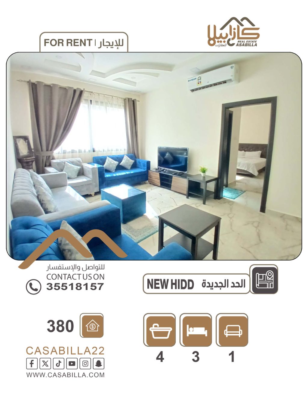 For rent: A luxurious, fully furnished apartment in the Al-Hadd Al-Jadeedah (New Hadd) area. It consists of 3 master bedrooms, a living room with a guest bathroom, a fully equipped kitchen, a balcony, an elevator, and a private parking space. The area is 135 square meters, close to all services. The price is 380 dinars, including electricity with a consumption limit of 30 dinars. For inquiries.