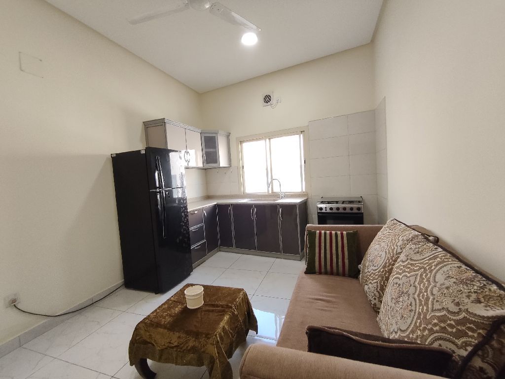 Tubli 1 BHK furnished flat for rent. BD220 with EWA, BD30 limit. Rent is non-negotiable. One-year fixed agreement. Hall with open kitchen, 1 bedroom, and 1 bathroom. Elevator available. Reference number VK 050101. Contact for details.
