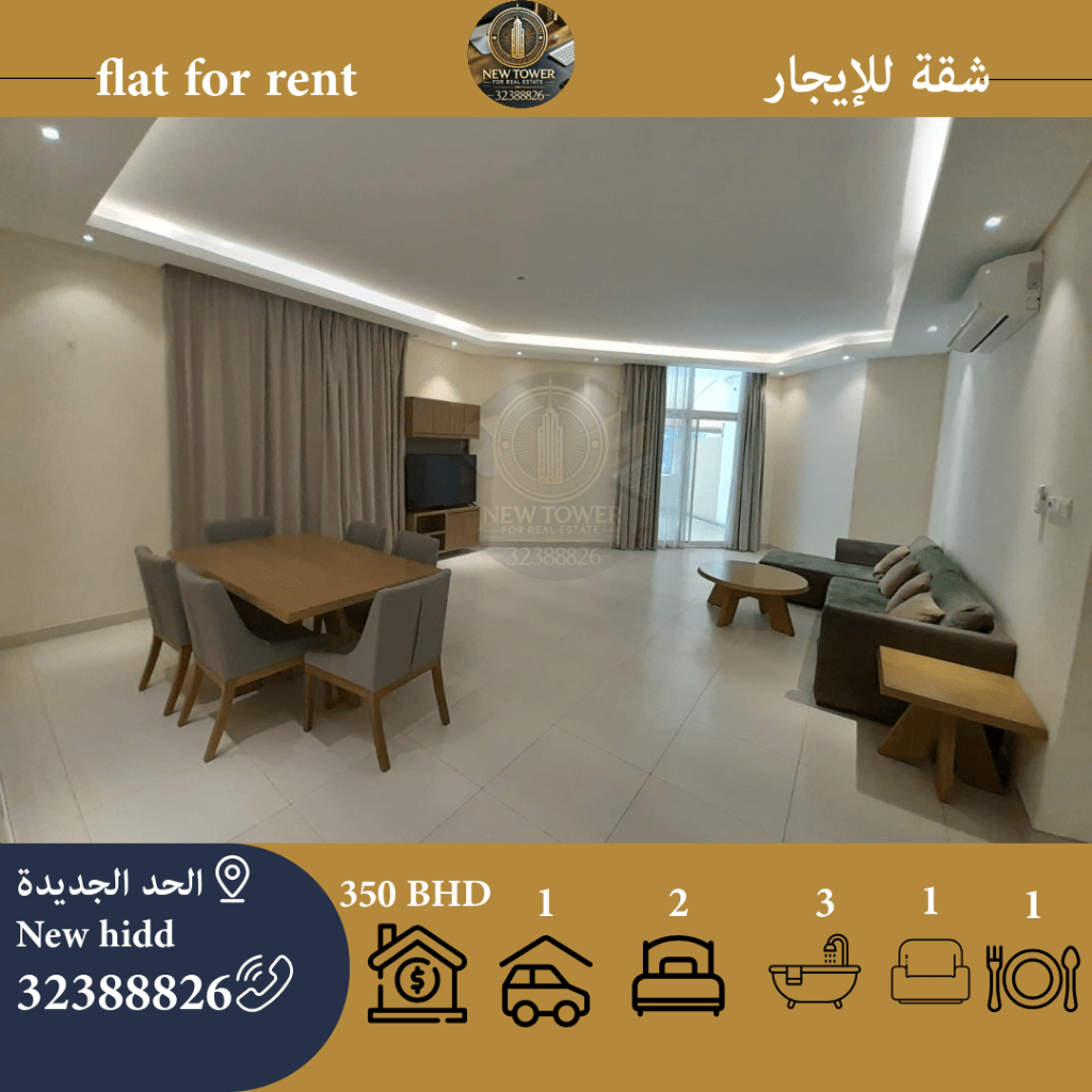 For rent: A furnished apartment in Al-Hadd with two bedrooms, three bathrooms, a kitchen, a living room, an elevator, and parking for 350 Bahraini dinars, including electricity for 40 dinars. Contact: Al-Burj Al-Jadeed Real Estate.