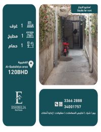 We have a studio apartment for rent in Al Qudaibiya, containing one room, a bathroom, and a kitchen. It is furnished and includes electricity. The price is 120 dinars. License number B201804/0125. For contact: Bu Abdullah. Ad number 87.