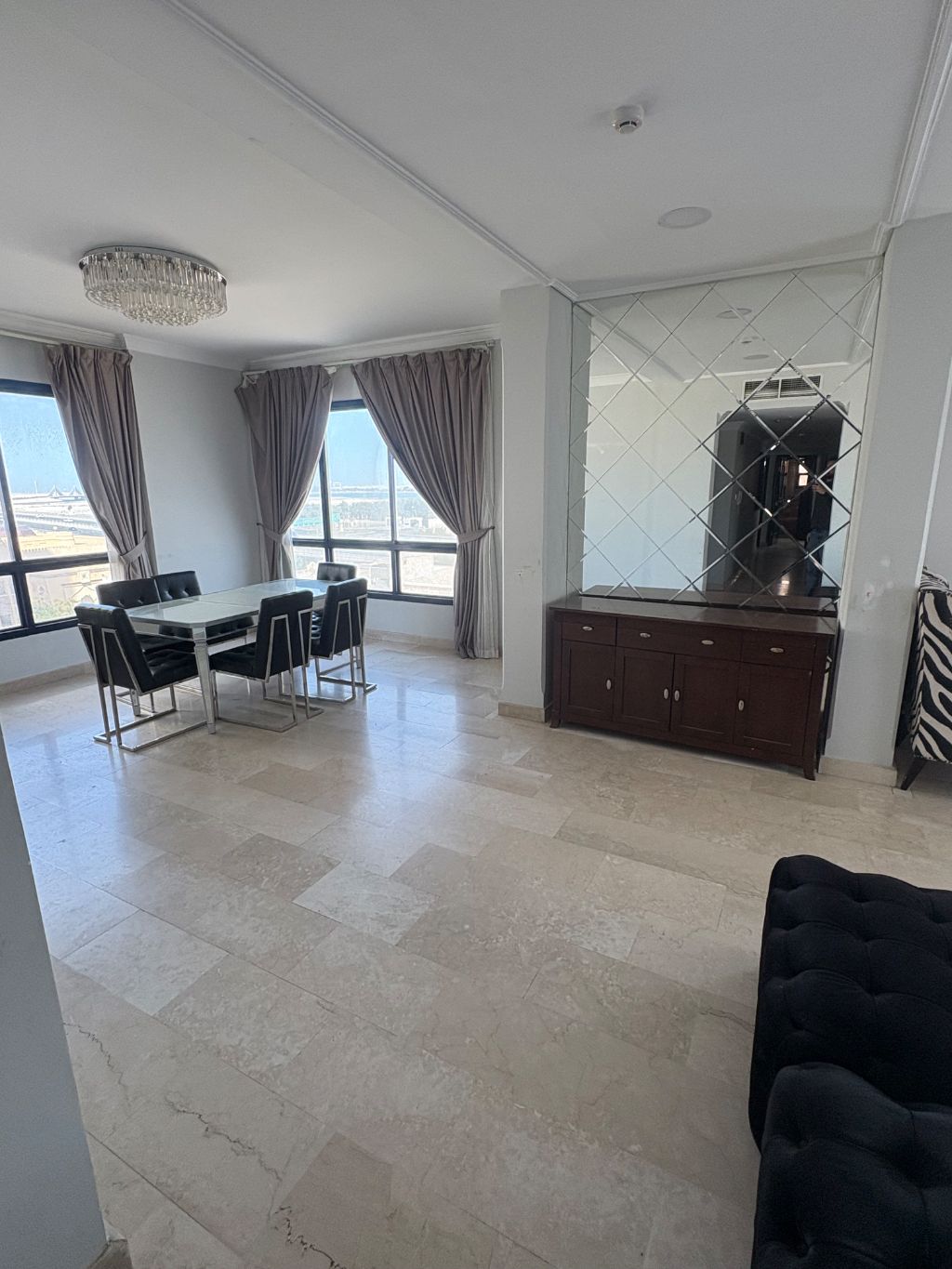 A fully furnished, large 3-bedroom, 4-bathroom flat in Hoora, Bahrain, with a swimming pool, small gym, and elevator. It is a one-floor flat for privacy, located in a quiet and calm area. Rent is BD400, excluding electricity.